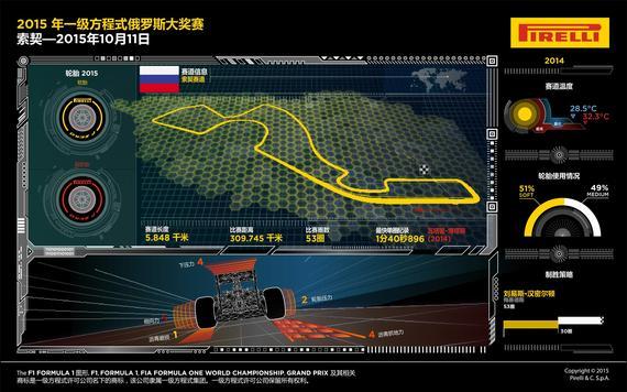 米兰,2015年10月5日——P Zero黄色软胎和红色超软胎将会亮相俄罗斯大奖赛:较之去年,该项赛事元年时的中性胎和软胎组合,今年的轮胎配方更软。由于在2014年之前没有任何数据支撑,在赛事元年做出了保守的决定,但现在,有了去年比赛的实战数据,可以根据赛道的确切特性,做出更为准确的决定。全新的赛道沥青表面光滑平顺,当地温和的天气条件,加之赛道大都是中速弯角,这一切都使得轮胎磨损和性能衰退程度相对较低。