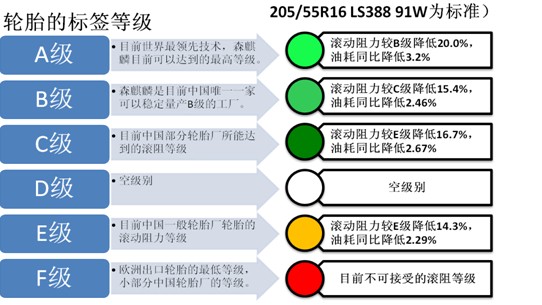 标签上的评分从A到G,A为最省油,G为最费油。要注意的是,D不作为一个评选级别,它只是作为一个分水岭。使用A级和G级轮胎有可能相差7.5%的油费。